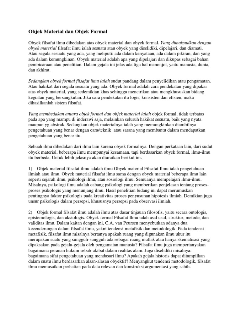 Lasiyo dan yuwono 1985 hlm. Objek material mempelajari secara langsung pekerjaan akal dan mengevaluasi hasil hasil dari objek formal ilmu itu dan mengujinya dengan realisasi praktis yang sebenarnya. Objek material adalah sesuatu yang realitasnya ada. Obyek material filsafat ilmu itu bersifat universal umum yaitu segala sesuatu yang ada realita sedangkan objek formal filsafat ilmu pengetahuan ilmiah itu bersifat khusus dan empiris. Penjelasan diatas dapat dianalisa dan dijelaskan tentang perbedaan antara objek material dan objek formal filsafat ilmu. Oleh karena itu yang membedakan antara filsafat dengan ilmu ilmu lain terletak dalam objek material dan objek formalnya.