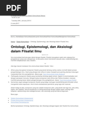 Epistemologi atau teori pengetahuan adalah cabang filsafat yang berurusan dengan hakikat dan linkup pengetahuan pengandaian pengandaian dan dasar dasarnya serta pertanggung jawaban atas pernyataan mengenai pengetahuan yang dimiliki. Ontologi adalah reori dari cabang filsafat yang membahas tentang realitas. Contoh ontologi epistemologi dan aksiologi dalam kehidupan sehari hari written by hairus saleh saturday january 19 2019 3 comments edit filsafat merupakan ilmu yang membahas tentang teori teori abstrak hingga para pelajarnya kesulitan mengaitkannya dengan kehidupan. Contoh implementasi kajian filsafat ontologi epistemologi aksiologi kinerja guru pembimbing khusus ditinjau dari kualifikasi pendidikan masa kerja dan status kepegawaian di sd inklusif surabaya oleh. Berikut penjelasan ontologi epistemologi dan aksiologi sebagai bagian dari filsafat ilmu komunikasi. Onto berarti ada dan logos berarti ilmu.