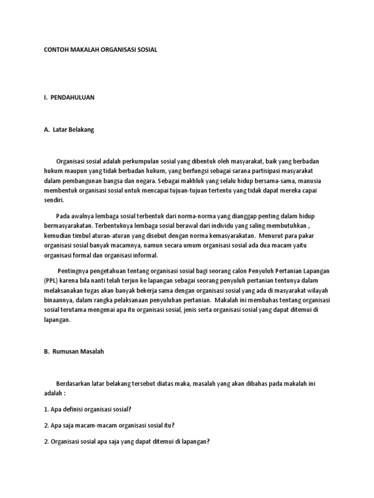 Kelompok sosial berupa paguyuban ini terbentuk karena adanya persamaan antara masyarakat satu dengan lainnya persamaan yang ada diakibatkan karena adanya persamaan tempat wilayah orang orang yang berasalh di cirebon. Organisasi sosial adalah bentuk dan upaya masyarakat sebagai sarana partisipasi dalam pembangunan nasional dan negara dan dapat membentuk organisasi sosial dengan tujuan tertentu. Berikut ini adalah beberapa contoh masalah sosial tersebut. Dalam kamus besar bahasa indonesia kata organisasi didefinisikan sebagai unit yang terdiri dari bagian bagian struktur atau orang dari suatu masyarakat dengan tujuan tertentu. Jika organisasi sosial terdiri dari individu atau masyarakat sebagai anggotanya yang terorgaisir maka keluarga juga bisa disebut sebagai organisasi sosial.
