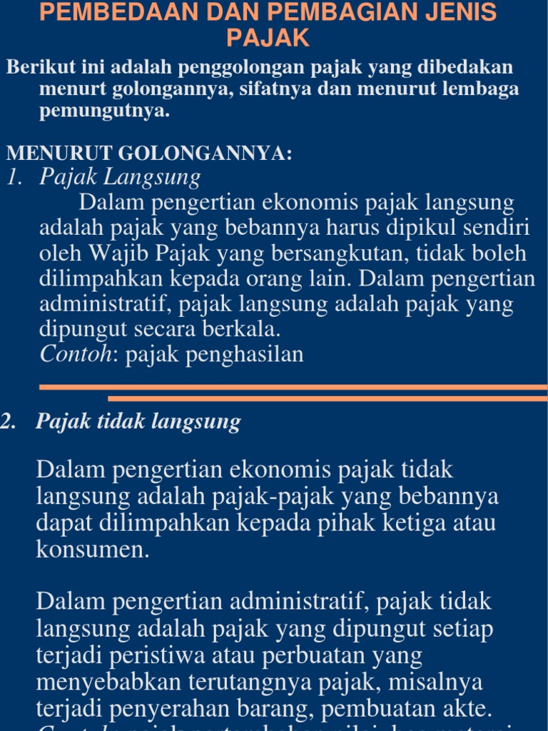 Contoh pajak tidak langsung. Demikian pembahasan tentang pengertian jenis contoh manfaat dan ciri ciri pajak mohon maaf jika ada kesalahan dalam penulisan dan pembahasan. Pajak ini tidak memiliki hasil secara langsung. Guruakuntansicoid kali ini akan membahas tentang pengertian pajak langsung dan tidak langsung perbedaan diantara keduanya beserta contohnya. Pajak tidak akan membuat kontra prestasi pada pemerintah secara langsung. Pajak langsung pajak langsung merupakan pajak yang mana bebannya harus ditanggung sendiri oleh orang yang bersangkutan wajib pajak dan tidak dapat dialihkan kepada pihak lain. Dapat dikatakan bahwa pajak ini harus dibayarkan oleh pihak yang hendak mengekspor barangnya ke luar negeri.