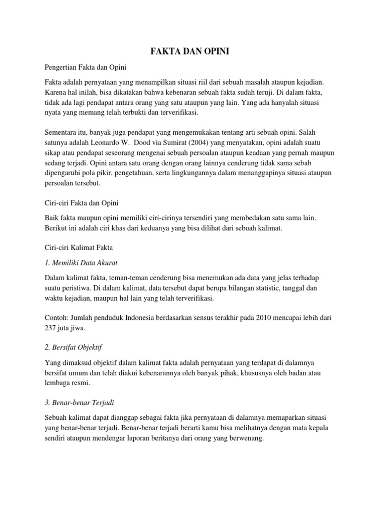 9 tahun 1998 bahwa kemerdekaan menyampaikan pendapat adalah hak setiap warga negara untuk. Contoh kalimat fakta dan opini dalam satu paragraf madu adalah hasil produksi lebah yang berasal dari nektar bunga dan berperan sebagai pemanis alami. Namun keduanya dapat disandingkan penggunaannya dalam membahas masalah masalah tertentu. Contoh opini opini adalah salah satu kata yang hampir mirip atau selalu berdampingan dengan kata fakta dan keduanya memliki sebuah perbedaan yang sangat jelas dan artikel saya kali ini tujuannya untuk menjelaskan keduanya baik dari sisi pengertian dan contoh contoh kalimat opini dan fakta untuk membedakan antara keduanya. Kalimat fakta khusus adalah kalimat fakta yang kebenarannya berlaku sementara atau beberapa waktu tertentu saja. Contoh paragraf opini kali ini akan membantu kamu untuk paham tentang paragraf opinipentingnya anda mempelajari paragraf opini adalah agar anda dengan mudah membedakan mana opini dan mana fakta.