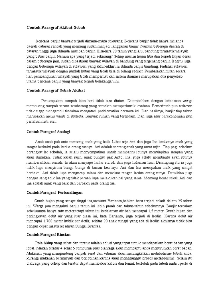 Contoh paragraf sebab akibat 1 akibat 2. Contoh lain dari paragraf yang pola pikirnya induktif adalah paragraf analogiparagraf generalisasi dan paragraf sebab akibat. Contoh paragraf sebab akibat. Paragraf sebab akibat ini merupakan salah satu contoh pola berfikir induktif. Hubungan sebab akibat atau sebab akibat adalah hubungan yang menjelaskan bahwa suatu peristiwa atau peristiwa dikaitkan dengan sebab tertentu. Untuk lebih detailnya silakan simak ulasan dibawah ini dengan seksama.