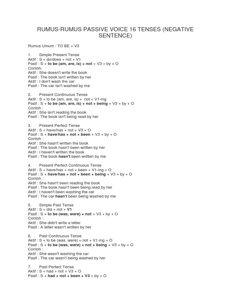 Dari 12 contoh kalimat active dan 12 contoh kalimat passive voice simple past tense di atas kamu bisa melihat perubahan kata kerja yang digunakan. Caranya gampang banget dan dapat dipahami oleh siapa saja terutama pelajar pemula. Kalimat pasif dibentuk dari kalimat aktif dengan menjadikan subject dalam kalimat aktif sebagai object dalam kalimat pasif begitupun sebaliknya. Anita is writing the letter right now. Surat tersebut sedang ditulis oleh anitasimple past. Hal yang harus diperhatikan dalam membuat contoh kalimat past tense adalah memberikan keterangan waktu adverb of time agar pembaca atau orang yang diajak bicara dapat memahami bahwa pekerjaan yang kita maksud terjadi.