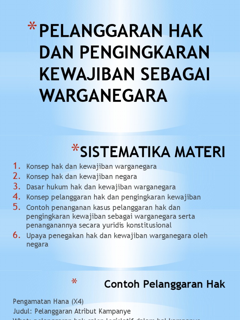 Kasus kasus pelanggaran hak dan pengingkaran kewajiban disebabkan oleh faktor faktor tertentu dan tidak jarang kasus kasus tersebut tidak dapat terselesaikan oleh hukum di indonesia. Pelanggaran hak warga negara terjadi ketika warga negara tidak dapat menikmati atau memperoleh haknya sebagaimana mestinya yang ditetapkan oleh undang undang. Selain itu pelanggaran tersebut juga terjadi karena adanya pelalaian ataupun pengingkaran. ø contoh pengingkaran kewajiban di indonesia pengingkaran kewajiban warga negara banyak sekali bentuknyamulai dari yang sederhana sampai yang berat diantaranya adalah. Hak asasi manusia dimiliki oleh setiap warga negara yang tinggal di indonesia. Berikut beberapa contoh pelanggaran pelaksanaan hak dan kewajiban negara terhadap hak hak dasar warga negara.