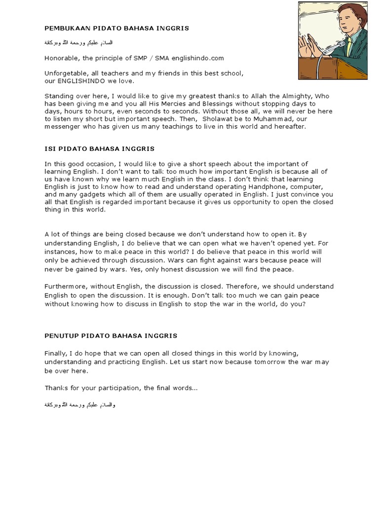 Contoh pembukaan pidato bahasa inggris. Baik itu acara pernikahan acara ulangtahun. Pidato bahasa inggris singkat tentang kebersihan lingkungan sekolah. 15 contoh pembukaan pidato bahasa inggris dan artinya dalam dunia publik kita pasti mengerti bahwa pidato merupakan suatu kegiatan dimana kita berbicara di depan khalayak umum untuk menyampaikan pendapat atau aspirasi mengenai suatu hal yang penting dan layak diperbincangkan. Belajar dasar bahasa inggris contoh pembukaan pidato dalam bahasa inggris dan artinya pidato adalah sebuah aktivitas untuk menyampaikan atau mengungkapkan apa yang ada dalam pikirkan seseorang kepada orang lain secara lisan. Pidato di bawah bisa digunakan oleh pelajar sekolah sd smp sma atau bahkan mahasiswa. Last but not least thank you for the opportunity given the time to deliver this short speech.