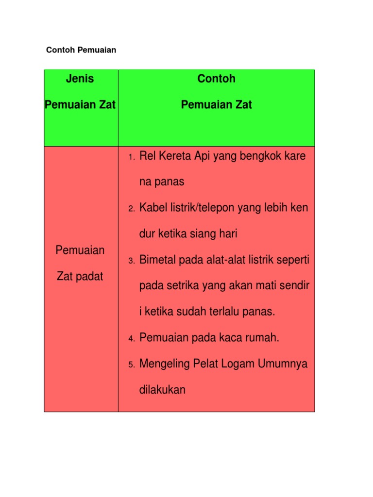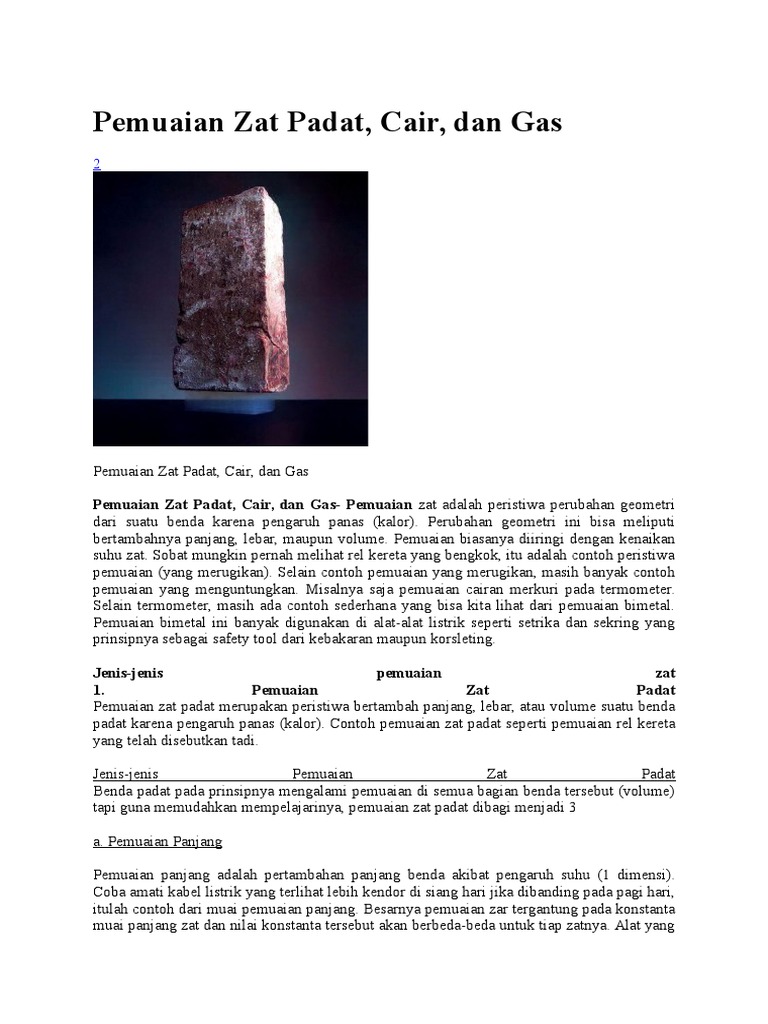 Pada umumnya semua benda akan memuai jika dipanaskan tetapi tidak bemikian dengan air. Pemuaian zat padat adalah jenis pemuaian yang terjadi pada suatu bendacontohnnya seperti bingkai jendela rel kereta api dan kabel listrik. Untuk zat cair dan gas yang bentuknya tidak tentu maka kita hanya membahas pemuaian volumenya. Namun sebelum itu kita ulas dahulu materi tentang pemuaian panjang dan luas berikut ini. Pada pemuaian zat cair hanya dikenal ukuran volume sehingga pada zat cair hanya dikenal pemuaian volume. Zat cair pengertian zat cair.