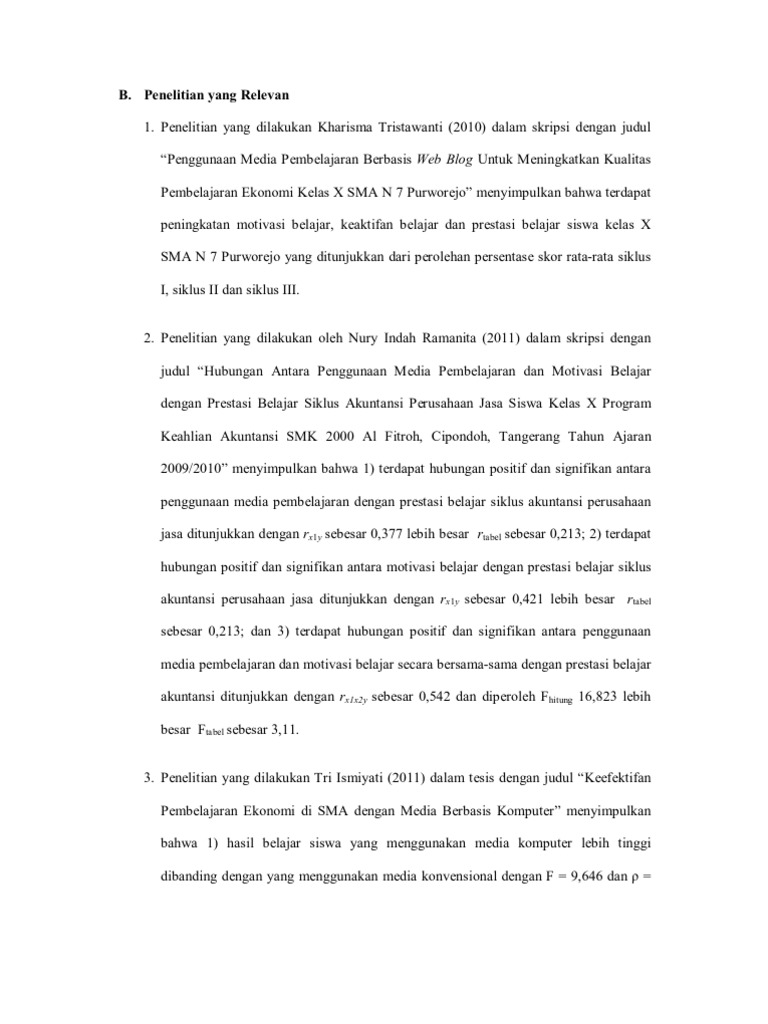 Contoh penelitian yang relevan. Pengertian relevan adalah mempunyai kaitan dan hubungan erat dengan pokok masalah yang sedang dihadapiainon mohd. Penulisan penelitian terdahulu yang relevan. Contoh penulisan penelitian terdahulu berdasarkan penelitian yang dilakukan oleh yuningsih 2008 dengan judul analisis sumber dan penggunaan modal kerja pada ptade sula. Contoh nilai nilai karakter dalam pembelajaran ipa dan sikap ilmiah perangkat pembelajaran dalam skripsi ipa. Penelitian yang relevan pada bagian ini peneliti menggunakan sumber acuan khusus dari penelitian penelitian terdahulu yang terdapat pada jurnal skripsi buletin dan yang lainnya. Semua itu tergantung daripada peminatan seseorangpembimbing.