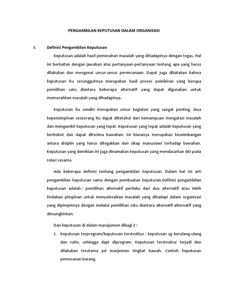 Contoh pengambilan keputusan dalam organisasi. Pengambilan keputusan dengan memperhatikan organisasi perorangan dan kelompok perorangan yang terlibat dalam proses pengambilan keputusan dinyatakan dalam teori sistem. Proses pengambilan keputusan kelompok adalah salah satu corak proses pengambilan keputusan dalam organisasi. Demikian juga halnya dalam suatu organisasi pengambilan keputusan atau decision making merupakan suatu hal yang hampir tidak bisa dihindari. Kreativitas pengambilan keputusan dapat diterapkan pada individu atau kelompok karena pengambilan keputusan individu membantu pengambilan keputusan dalam organisasi saat ini maka pemahaman dinamika kelompok dan tim menjadi relevan dengan pengambilan keputusan sebagai contoh pembahasan masalah dan fenomena kesesuaian nilai dan etika kelompok seperti perubahan risiko bahwa kelompok mungkin. Pengertian pengambilan keputusan decision making dan jenis jenisnya dalam kehidupan sehari hari kita selalu dihadapi dengan berbagai masalah ataupun pilihan sehingga kita perlu mengambil keputusan yang terbaik untuk menghadapi masalah tersebut. Pengambilan keputusan dapat diartikan sebagai suatu proses penilaian dan pemilihan dari.