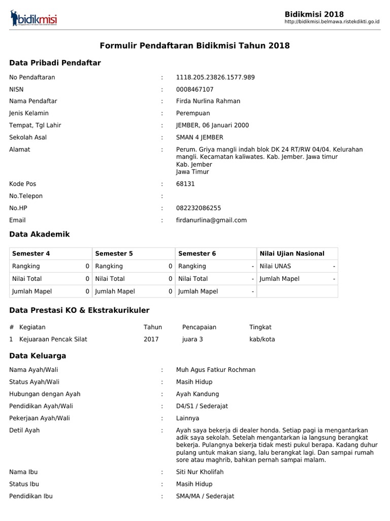 Contoh pengisian bidik misi. 5tempelkan satu pasfoto berwarna ukuran 3x4 di tempat yang telah disediakan. Contoh pengisian deskripsi ayah pekerjaan harian ayah adalah petani. 6semua pertanyaan harus dijawab kekurang lengkapan dan kekurang jelasan pengisian mengakibatkan ditolaknya pendaftaran bidik misi. Bmalfianqomaruddin140411100088 kirim ke 031 3131 0600. Pengumuman pengisian nik dan cetak ulang kartu peserta bidikmisi formulir bidikmisi sehubungan dengan dimulainya proses seleksi calon penerima bidikmisi di perguruan tinggi bagi para siswa yang telah mendaftar bidikmisi untuk seluruh jalur seleksi dipersilahkan untuk mengisi nomor induk kependudukan nik di sistem bidikmisi dan melakukan cetak ulang kartu peserta dan serta formulir bidikmisi. Berangkat dari berbagai masalah dan kendala yang dihadapi oleh para siswa yang sedang melakukan proses pengisian formulir pendaftaran mulai.