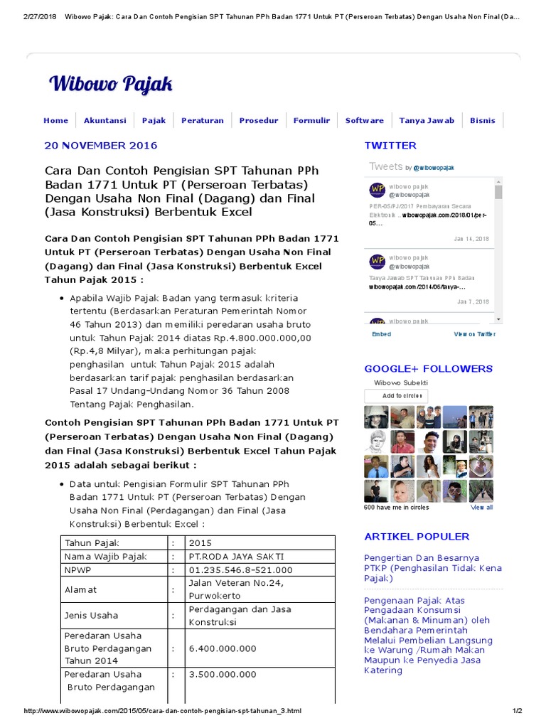 Bisa lihat di artikel ini ada contoh pengisian spt tahunan pph badan khususnya yg terkait pp 46 disitu ada unduhan file excel spt nya juga. Periksa hasil ekstrak dan cari file cara instalasitxt didalamnya dijelaskan urutan pemasangan file. Contoh pengisian spt tahunan pph badan 1771 non final pt. Contoh pengisian spt tahunan pph badan 1771 final spt tahunan merupakan laporan pajak yang disampaikan satu tahun sekali oleh wajib pajak kepada yang berhubungan dengan perhitungan dan pembayaran pajak penghasilan objek pajak penghasilan bukan objek pajak penghasilan ataupun harta dan kewajiban sesuai dengan peraturan pajak untuk satu tahun pajak atau bagian dari tahun pajak. Untuk membantu anda mempersiapkan dan memahami cara pengisian spt tahunan pph badan berikut kami uraikan tahapan dan langkah yang mudah untuk anda. Untuk jasa konstruksipenghasilan final sudah disediakan tempat isian di 1771 iv.