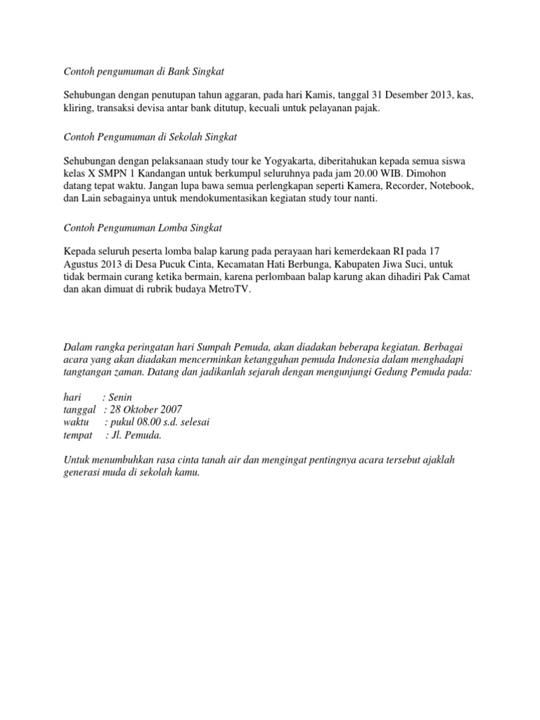 Pengumuman adalah pengertian ciri unsur jenis cara contoh untuk pembahasan kali ini kami akan mengulas mengenai pengumuman yang dimana dalam hal ini meliputi pengertian. Hal ini tidak terlepas dari orang orang kreatif yang. Oleh dosen pendidikan 2 diposting pada 22032020. Surat pengumuman ini biasanya akan kita temui di lembaga pendidikan perusahaan instansi pemerintahan maupun organisasi. Atau informasi tentang lomba 17 agustus antar komplek pencarian orang hilang dan lain lain. Lomba 17an lucu ketika sudah memasuki bulan agustus ada tiga hal yang paling ditunggu oleh semua masyarakat indonesia nomor satu adalah karnaval dan yang kedua adalah aneka lomba 17 agustus dan yang ketiga adalah banyaknya diskon atau potongan harga ketika belanja.