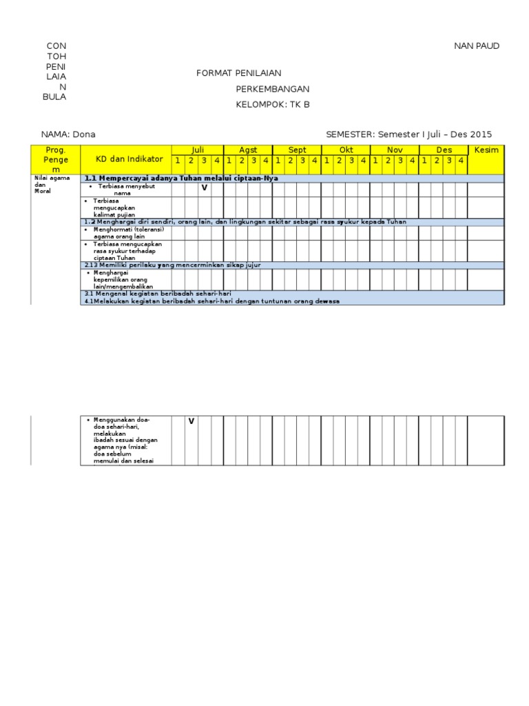Contoh penilaian checklist paud. Contoh format checklist skala capaian perkembangan paud. Contoh penilaian checklist paud skala capaian perkembangan. Pengertian penilaian ceklis adalah checklist yang diturunkan dari rencana pelaksanaan pembelajaran harian rpph yang memuat indikator pencapaian perkembangan anak yang sudah ditetapkan sebelumnya dan indikator tersebut sudah tercantum di dalam rpph. Contoh format penilaian mingguan penilaian bulanan dan kompilasi penilaian dalam kurikulum 2013 paud rekap hasil penilaian harian ke mingguan. Contoh penilaian ceklis harian paud. Penilaian ceklis checklist skala pencapaian perkembangan anak paudtkrakb ini merupakan salah satu dari teknik penilaian.