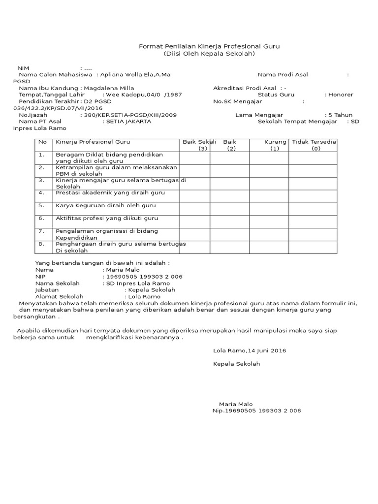 Contoh penilaian kinerja guru. Penilaian ini dilakukan melalui pengamatan dan pemantauan yaitu proses penilaian berdasar bukti yang dilakukan pada saat pelaksanaan pembelajaran sedang berlangsung. Buku 3 panduan diklat calon tim penilai jabatan fungsional. Format catatan dan evaluasi penilaian kinerja per kompetensi digunakan untuk mencatat semua hasil pengamatan dan pemantauan yang telah dilakukan sebagai bukti pelaksanaan penilaian kinerja guru. Penilaian kinerja guru juga dapat diartikan sebagai penilaian dari setiap butir kegiatan tugas utama guru dalam rangka pembinaan karir kepangkatan dan jabatannya. Contoh instrumen penilaian kinerja guru rabu 08 februari 2012 pk guru edit setelah adanya sertifikasi guru dengan berdampak pada pemberian tunjangan sertifikasi kepada guru yang tersertifikasi atau dianggap profesional maka diperlukan penilaian secara berkelanjutan terhadap guru profesional tersebut agar kinerjanya tidak berkurang. Catatan ini harus dilengkapi dengan bukti bukti fisik tertentu misalnya dokumen pembelajaran dan penilaian alat peraga dan media pembelajaran atau dokumen lain yang menguatkan bukti kinerja guru.