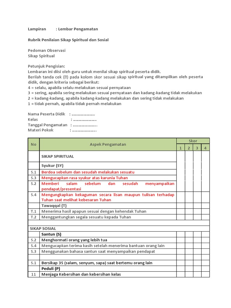 Contoh penilaian sikap spiritual. 2 kali berikut adalah contoh pedoman penilaian observasi sikap spiritual dalam kurikulum 2013petunjuk. Adapun topik pembahasan yang akan dibagikan yaitu tentang contoh indikator penilaian sikap spiritual dan sikap sosial pada kurikulum 2013. Kurikulum 2013 membagi kompetensi sikap menjadi dua yaitu sikap spiritual yang terkait dengan pembentukan peserta didik yang beriman dan bertakwa dan sikap sosial yang terkait dengan pembentukan peserta didik yang berakhlak mulia mandiri demokratis dan bertanggung jawab. Implementasi kurikulum 2013 berimplikasi terhadap penilaian sikap pengetahuandan keterampilan baik selama proses formatif maupun pada akhir periode pembelajaran sumatifproses penilaian dilakukan dengan cara menganalisis dan menafsirkan data hasil pengukuran capaian kompetensi siswa. Berilah tanda cek v pada kolom skor sesuai sikap spiritual yang ditampilkan oleh peserta didik dengan kriteria sebagai berikut. Pendidik dapat memilih jurnal sebagai instrumen penilaian atau instrumen lain yang relevan.