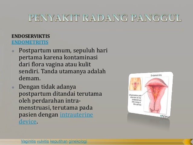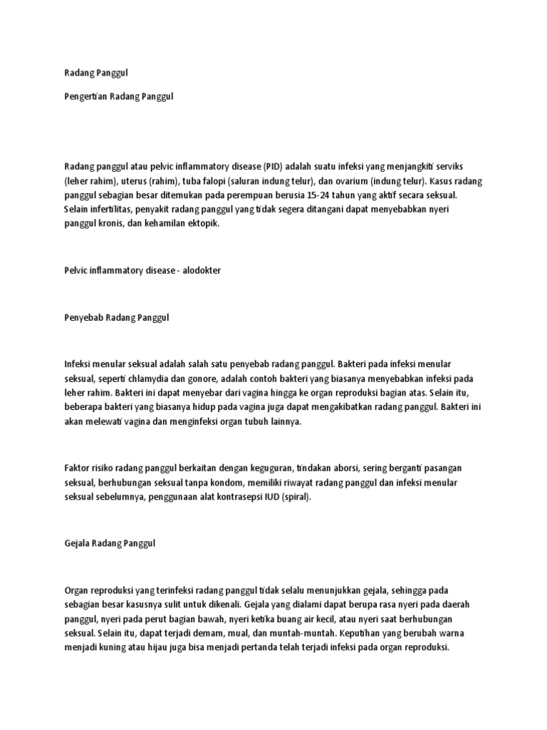 Proses penyakitnya dapat meliputi endometrium tubafalopii ovarium miometrium parametria dan peritonium panggul. Radang panggul atau pelvic inflammatory disease pid adalah infeksi pada organ reproduksi wanita seperti serviks rahim dan ovarium. Penyakit radang panggul merupakan komplikasi umum dari penyakit menular seksual pms. Penyakit radang panggul terjadi apabila terdapat infeksi pada saluran genital bagian bawahyang menyebar keatas melalui leher rahimbuth waktu dalam hitunganhari atau minggu untuk seorang wanita menderita penyakit radang panggulbakteri penyebab tersering adalah n. Wanita yang pingsan walau tak memiliki penyakit anemia atau darah rendah bisa juga dicurigai mengalami penyakit radang panggul. Pid adalah infeksi yang paling peting dan merupakan komplikasi infeksi menular seksual yang paling biasa sarwono2011.