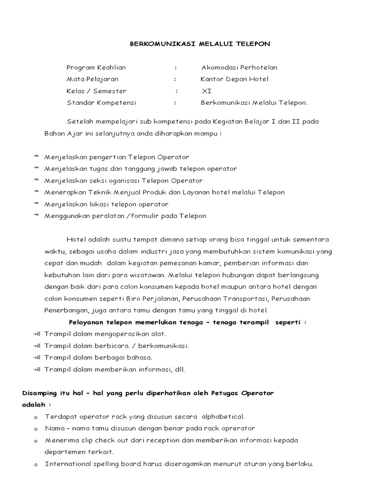 Etika berkomunikasi salah satu nya melalui telepon adalah penting apabila anda adalah karyawan perusahaan staf pada universitas sekretaris ataupun lainnya. Pemesanan kamar ini bisa kita lakukan di bagian reservasi front office suatu hotel. Anda tinggal bertanya tipe kamar yang anda inginkan harga dan fasilitasnya. Saat ini sudah hampir semua hotel yang bisa melakukan pemesanan kamar lewat telepon. Perlu diketahui bahwa pemesanan melalui telepon pastinya akan memerlukan percakapan dua. Sebelum menginap pada suatu hotel hal yang harus kita lakukan adalah melakukan pemesanan kamar reservasi.