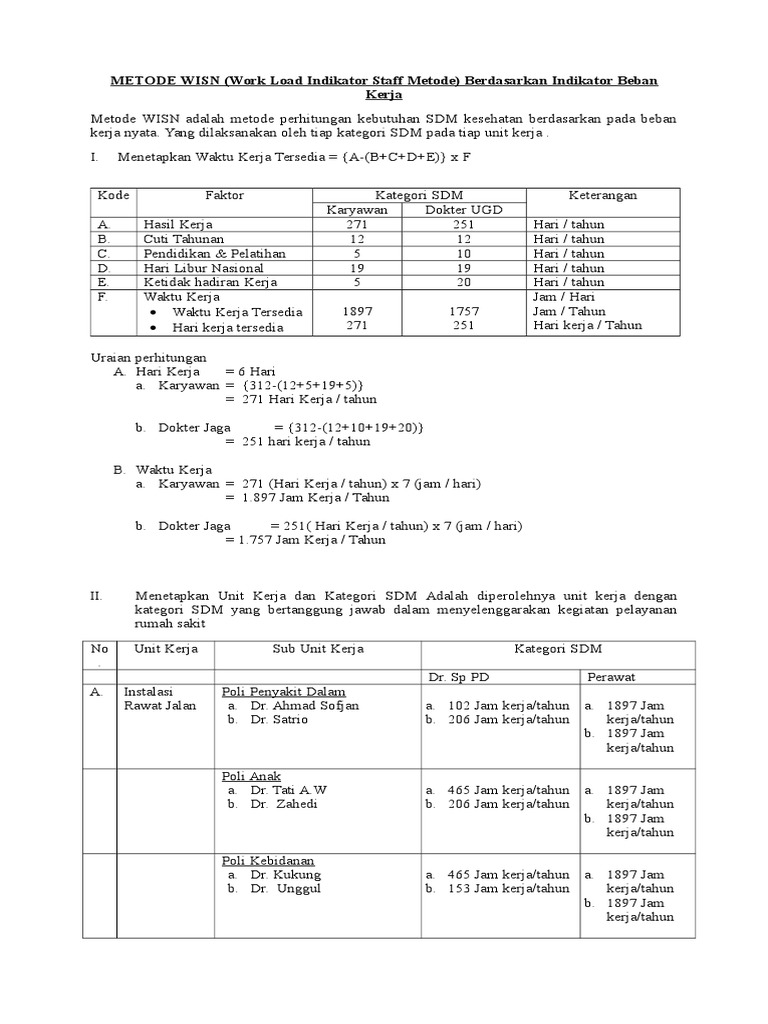 Contoh perhitungan metode wisn. Wisn workload indicator staff need adalah indikator yang menunjukkan besarnya kebutuhan tenaga kerja di suatu tempat kerja berdasarkan beban kerja sehingga alokasirelokasi akan lebih mudah dan rasionalmetode perhitungan kebutuhan sdm berdasarkan beban kerja wisn adalah suatu metode perhitungan kebutuhan sdm berdasarkan pada beban pekerjaan nyata yang. Peminatan manajemen pelayanan kesehatan fakultas kesehatan masyarakat 2departemen administrasi kebijakan kesehatan fakultas kesehatan masyarakat email. Dari hasil perhitungan tersebut dengan metode wisn di dapatkan kebutuhan tenaga kerja adalah 059 atau di bulatkan menjadi 1 petugas. 030 020 2 034 028 020 054 030 014 072 060 040 3 051 042 030 081 045 021 108 090 060 dst. Dari semua kelebihan metode wisn ini juga memiliki kekuranganhal ini dikarenakan langkah metode wisn ini sendiri yang terbilang panjang dan memerlukan ketelitian yang tinggi. Perhitungan kebutuhan tenaga berdasarkan beban kerja rekam medis 1125 am work load indikator staff need wisn adalah indikator yang menunjukkan besarnya kebutuhan tenaga pada sarana berdasarkan beban kerja sehingga alokasi atau relokasi tenaga akan lebih mudah dan rasional.