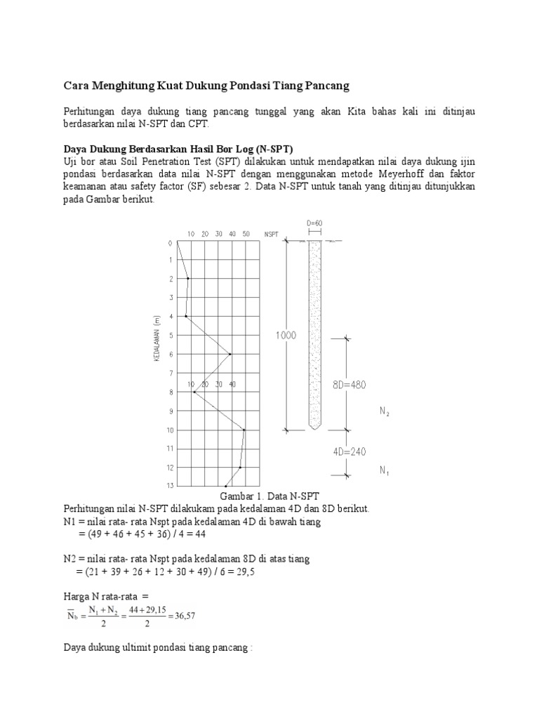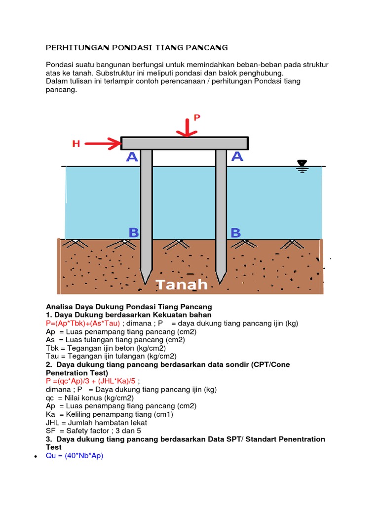 Dalam tulisan ini terlampir contoh perencanaan perhitungan pondasi tiang pancang. Pondasi tiang pancang hendaknya direncanakan sedemikian rupa sehingga gaya luar yang bekerja pada kepala tiang tidak melebihi gaya dukung tiang yang diizinkan. Daya dukung berdasarkan kekuatan bahan paptbkastau. P daya dukung tiang pancang ijin kg ap luas penampang tiang pancang cm2 as luas tulangan tiang pancang cm2 tbk tegangan ijin beton kg. P daya dukung tiang pancang ijin kg ap luas penampang tiang pancang cm2 as luas tulangan tiang pancang cm2 tbk tegangan ijin beton. Dari hasil ke tiga perhitungan di atas nanti daya dukung ijin tiang pancang yang akan dipergunakan adalah nilai daya dukung terkecil.