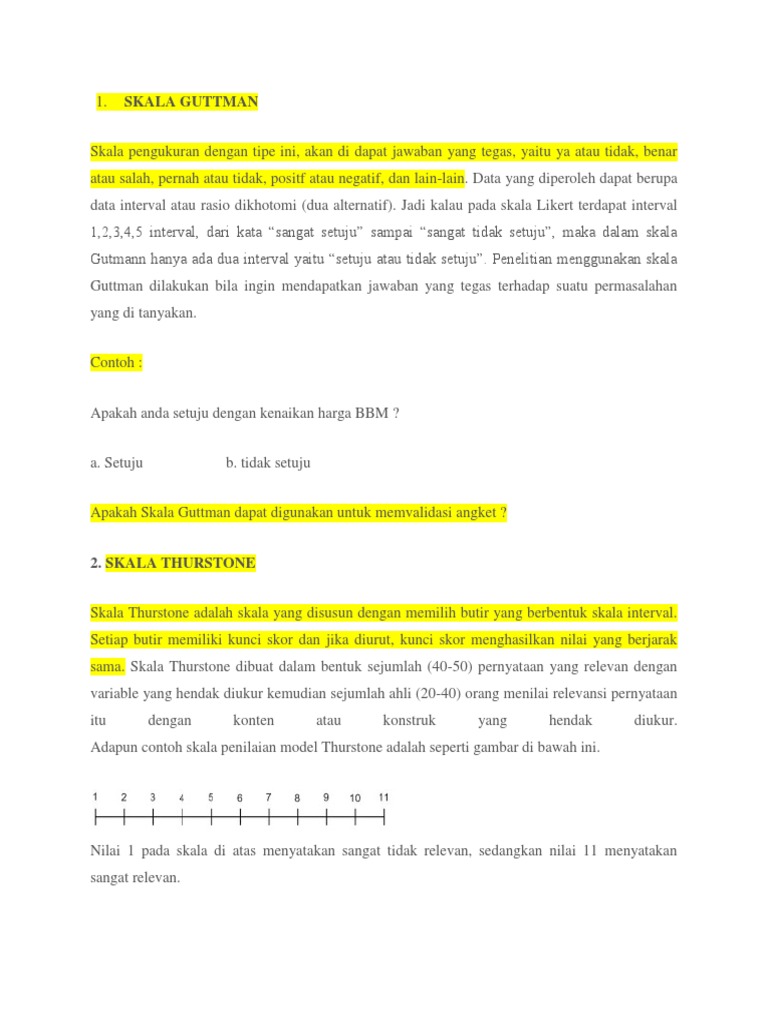 Skala pengukuran dengan tipe ini akan didapatkan jawaban yang tegas. Pengertian atau definisi skala likert adalah skala yang digunakan untuk mengukur persepsi sikap atau pendapat seseorang atau kelompok mengenai sebuah peristiwa atau fenomena sosial berdasarkan definisi operasional yang telah ditetapkan oleh peneliti. Kuesioner sebagai salah satu instrumen yang digunakan untuk mengumpulan informasidata penelitian memiliki berbagai macam skala pengukurannya. Skala ini memiliki ciri penting yaitu skala ini merupakan skala kumulatif dan skala ini digunakan untuk mengukur satu dimensi saja dari satu variable yang multi dimensi sehingga skala ini termasuk mempunyai sifat undimensional. Alau pada skala ikert terdapat interval dari kata sangat setuju sampai sangat tidak setuju maka pada skala uttman hanya ada dua interval yaitu setuju atau. Cara perhitungan dan hasilnya.