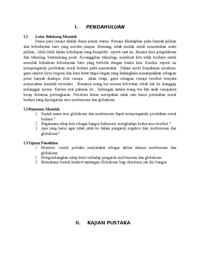 Perilaku masyarakat dalam perubahan sosial budaya di era global. Contoh perubahan sosial dari masyarakat berburu menuju ke masyarakat meramu. Oleh karena itu dibutuhkan peran indonesia di era globalisasi di berbagai bidang khususnya dalam bidang sosial dan budaya agar kehidupan sosial budaya yang dimiliki masyarakat tidak terjadi pergeseran yang dapat menimbulkan dampak negatif bagi kelangsungan kehidupan berbangsa dan. Sementara perubahan sosial budaya yang bersifat negatif dan mengarah pada kerusakan dan kemunduran kita tolak dan kita cegah. Dapat pula dikarenakan sebagai akibat dijajah oleh masyarakat lain. Bidang musik tentu menjadi contoh perubahan sosial budaya juga.