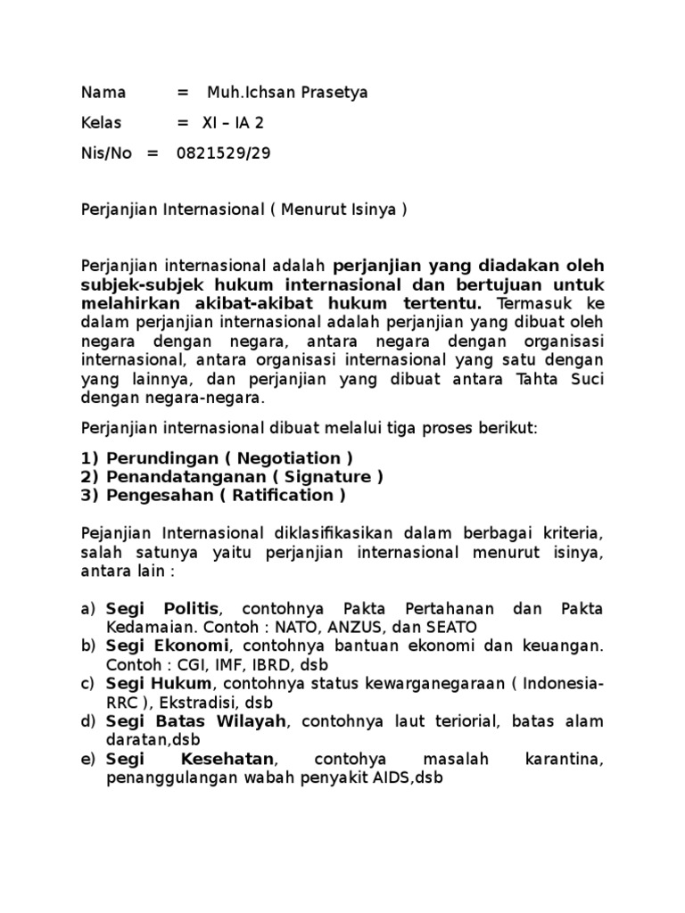 Contoh perjanjian internasional indonesia. Perjanjian indonesia dengan thailand membahas tentang laut andaman serta bagian utara selat malaka yang ditandatangani pada tanggal 17 desember 1971. Berikut ini contoh perjanjian internasional multilateral yang pernah dilakukan indonesia. Contoh perjanjian internasional yakni sebuah kesepakatan atau persetujuan yang dilakukan antara beberapa organisasi dengan skala internasional atau negara yang masuk dalam pengawasan aturan internasional. Adapun klasifikasinya suatu perjanjian internasional adalah sebagai berikut. Indonesia sendirimengadakan perjanjian dengan kerajaan belanda mulai dari perjanjianlinggarjati tentang penyerahan kedaulatan 1947 dan ditindaklanjuti denganperjanjian konferensi meja bundar kmb tentang masalah irian barat 1949kemudian disertai dengan perjanjian peralihan yang menampung kedudukanperjanjian internasional yang dibuat oleh pemerintah kerajaan belanda yangdinyatakan. Perjanjian bilateral di indonesia dan india di bidang pertahanan dan ekonomi pada tahun 2011 perjanjian bilateral indonesia dan vietnam dibidang kebudayaan dan.