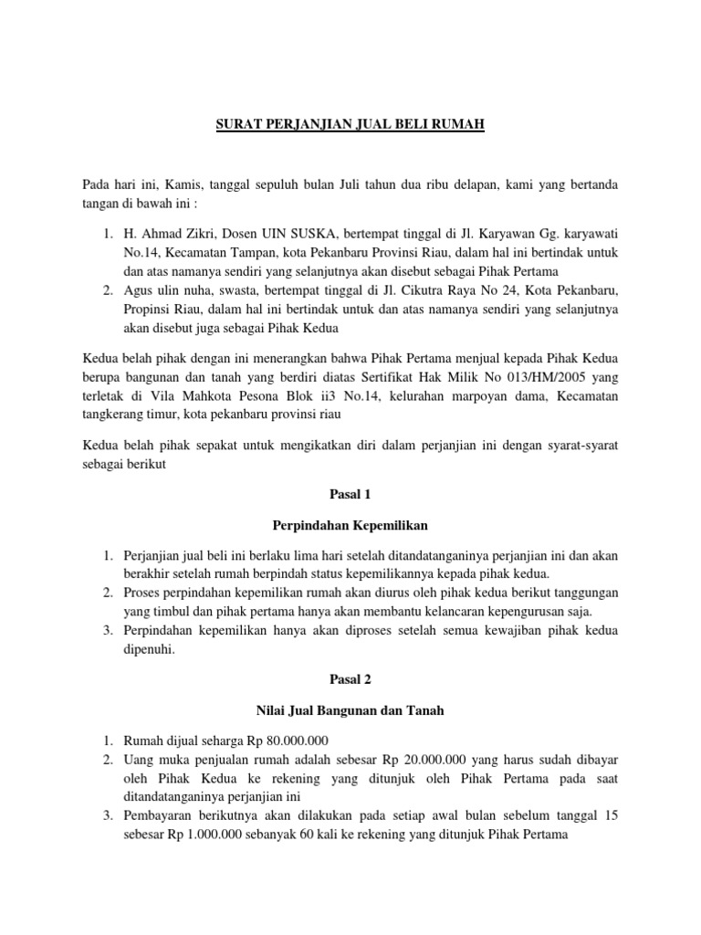 Contoh perjanjian jual beli rumah. Kebutuhan masyarakat akan kepemilikan aset khususnya dibidang properti kini makin meningkat dari waktu ke waktu. Dalam proses transaksi jual beli rumah maupun jual beli apapun yang memiliki nilai jual tinggi sebaiknya digunakan contoh surat perjanjian jual beli rumah dengan 11 pasal berikut ini. Surat perjanjian jual beli merupakan sebuah surat yang dibuat oleh seorang penjual dan pembeli untuk menjelaskan hak dan kewajiban yang tidak boleh dilanggar oleh kedua belah pihak dalam suatu urusan jual beli. Beberapa hal penting yang tertera di surat perjanjian jual beli tanah mungkin akan terdengar awam dan sulit di mengerti. Ditambah lagi tidak banyak sumber contoh surat jual beli tanah yang ada baik di internet maupun yang dapat dibeli. Anda bisa mengunduh download contoh surat perjanjian jual beli rumah versi lamudi dalam bentuk pdf dan doc di akhir artikel ini.