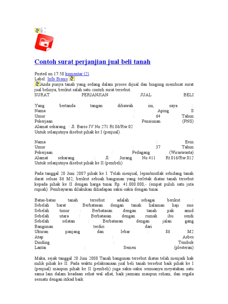 Ditambah lagi tidak banyak sumber contoh surat jual beli tanah yang ada baik di internet maupun yang dapat dibeli. Penjual berkewajiban menyerahkan tanah kepada pihak pembeli dan dan. Sementara demand terhadap tanah selalu naik dikarenakan pertumbuhan penduduk yang juga selalu naik. Contohnya adalah pada proses jual beli tanah. Walaupun contoh surat perjanjian jual beli tanah ini nampak ringkas namun ia sangat penting dan berguna kepada anda sebagai pembeli atau penjual. 00 cara pembayaran untuk pembayaran tanah berikut bangunan yang terletak di atasnya tersebut pihak kedua menerapkan cara pembayaran dengan syarat dan ketentuan yang juga telah disepakati pihak pertama iaitu dengan cara tunai atau ansuran.