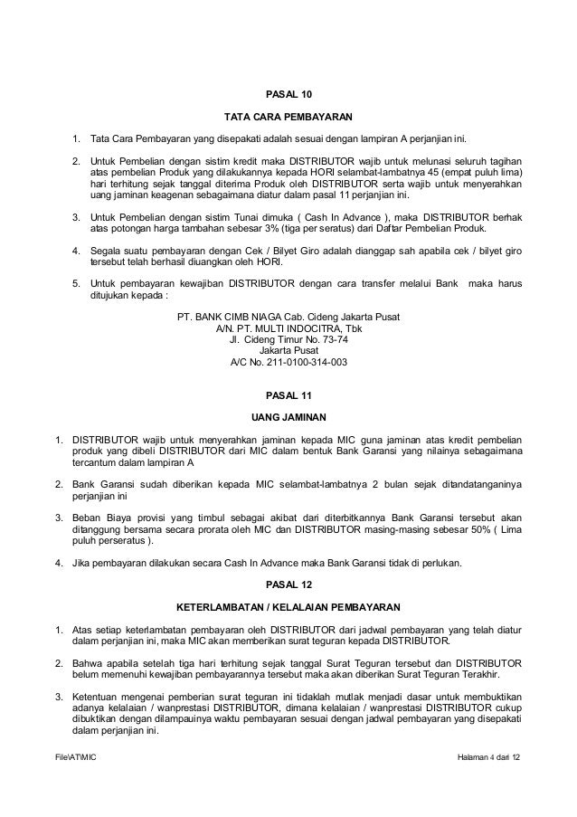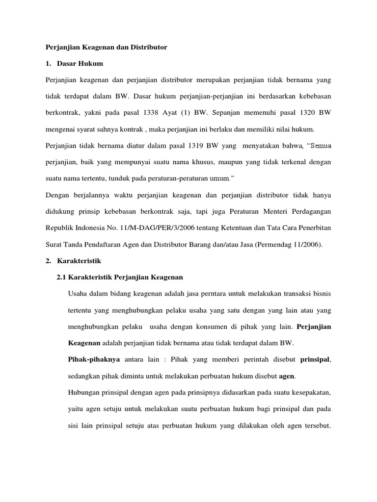 Contoh perjanjian keagenan dan distributor. Sebagai contoh silakan lihat contoh surat perjanjian bermitra mou dibawah ini. Masalah hukum keagenan dan distributor ini juga banyak bersentuhan dengan hukum bisnis internasional mengingat karena keterbatasannya prosedur luar negeri sering kali menunjuk agen pemasaran dari produk produknya disuatu negara tujuan pemasaran. Kewajiban investor asing dalam bidang migas dan minerba. Distributorsusukambingetawa maret 8 2015. Perjanjian penunjukan distributor harga. Contoh surat perjanjian agen atau distributor.
