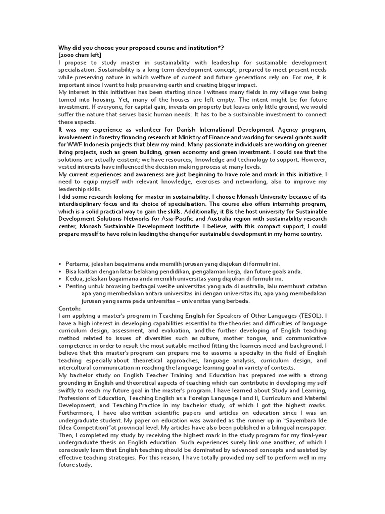 Ini merupakan contoh tulisan biasanya sekitar 2 halaman yang menerangkan kelebihan anda alasan memilih jurusan yang anda pilih ketertarikan terhadap riset tujuan anda dan kontribusi apa yang anda akan lakukan ketika melamar beasiswa tersebut. Jika kamu disarankan untuk merubah bagian tertentu pertimbangkanlah dahulu dan buatlah perubahan tersebut sendiri bukan meminta orang lain untuk melakukannya.