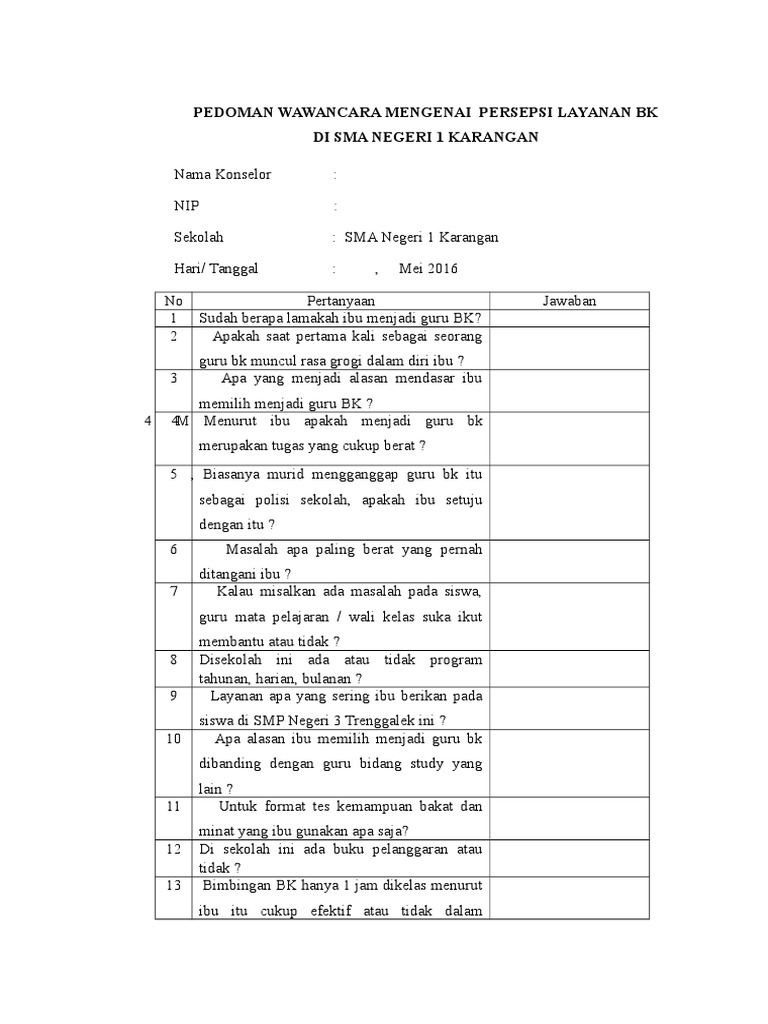 Kepala sekolah ma raudlatul muttaqin kemampuan siswa dalam mengikuti pembelajaran bahasa arab khususnya maharah qiraah tidak terlalu aktif hal yang melatar belaki ini adalah segian banyak dari siswa adalah bukan dari pondok yang notabennya tidak tau atau jarang mendengar dan membaca kosa kata bahasa arab bahkan. No aktivitas skor 1. Contoh format pedoman wawancara penelitian skripsi adalah pokok pembahasan materi skripsi dan tugas akhir yang akan dijelaskan dengan lengkap dan detail pada materi belajar berikut ini. Kalau susahnya sedang ngajar ada siswa yang gojek sendiri dan kalau nilai ulangannya jelek jadi kecewa. Siswa menjawab 2 kali pertanyaan 1. Contoh pertanyaan dan jawaban wawancara dengan guru tentang penggunaan model pembelajaran di kelas ini merupakan hasil wawancaraku dengan seorang guru disalah satu sekolah di kabupaten simalungun di daerah tempat tinggalku.