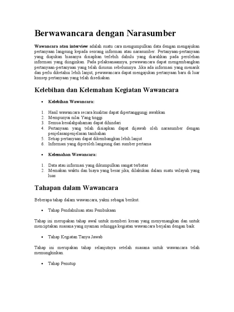 Contoh pertanyaan wawancara dengan narasumber. Contoh wawancara menurut kamus besar bahasa indonesia wawancara adalah proses tanya jawab lisan antara dua orang atau lebih secara langsung. Kegiatan wawancara memang kerap dilaksanakan baik itu wawancara kerja maupun wawancara dengan narasumber guna mendapatkan data maupun informasi. Nah sebelum ke contoh contoh laporan hasil wawancara alangkah baiknya kita mengetahui dulu apa itu wawancara pengertian wawancara susunan laporannya. Berikut ini adalah beberapa contoh teks wawancara mengandung unsur berupa 5w 1h. Pengertian macam tugas syarat dan contoh dalam membutuhkan sebuah informasi saat ini kita pastinya memerlukan narasumber untuk dapat diwawancaraidan orang yang diwawancarai tersebut yaitu narasumber yang memang harus benar benar ahli dalam bidang tertentu. Entah itu narasumber.