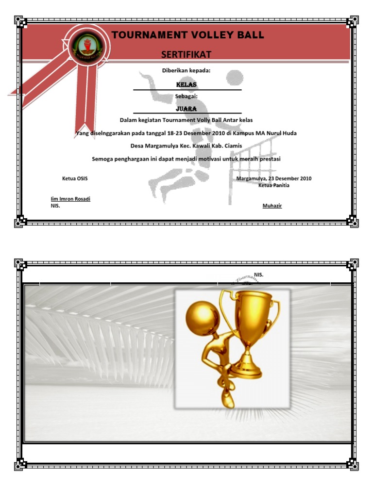 Contoh sertifikat piagam penghargaan bisa lihat disini. Selain bisa diedit seara manual format word anda juga bisa menggunakan file format excel untuk membuat piagam secara otomatis.