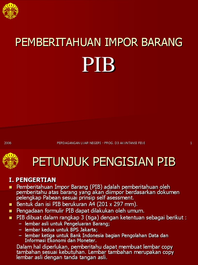 Lawan transaksi saya tidak tahu 3. Untuk pib kolom ini diisi dengan nomor yang tercantum dalam pib ditambah dengan tanda tagar diikuti kode kppbc tanpa spasi. Untuk peb yang sudah dilaporkan e faktur dan dibatalkan saya juga tidak tahu 4. Diisi pada kolom yang disediakan dengan nilai asuransi barang ekspor yang bersangkutan dalam valuta asing sesuai pengisian pada kolom nomor 30 jenis valuta asing. Sekarang klik tab halaman 2 dan masukkan nama pimpinan perusahaan dan npwp serta nama pejabat penandatangan. Merupakan kombinasi angka yang akan diisi dengan identitas bank yang akan anda gunakan tanggal pib dibuat dan nomor seri edi electronic data interchnage jenis jenis pemberitahuan impor barang pemberitahuan impor barang biasa adalah pib yang diajukan untuk sekali impor baik untuk barang impor yang telah tiba dan yang diajukan sebelum barang impor tiba.