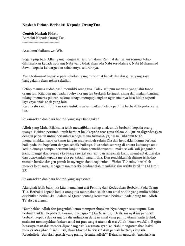 Anak sholeh tentunya sebiah yang di damba dambakan bagi orang tua karena hal ini merupakan salah satu keberhasilan dalam mendidikan dan contoh dalam prilaku. Kesimpulan pidato saya ialah adab menghormati orang tua adalah salah satu adab yang baik kepada orang tua. Teks pidato anak soleh teks pidato anak soleh. Mudah mudahan pidato saya bermanfaat bagi kita semua. Alhamdulillahirabbilalamin washolatu wassalamu ala ashrofil ambiyai walmursalin sayyidinaa wa maulana muhammadin. Silahkan anda edit seperti.