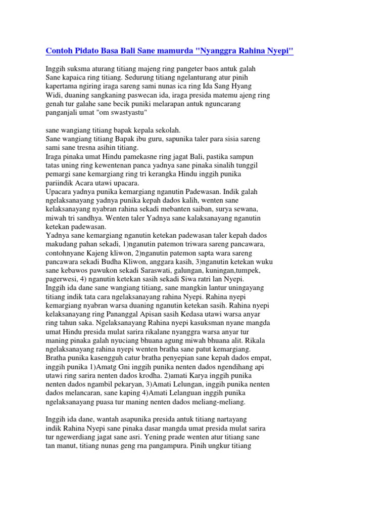 Para manggala sane singgihang titiang. 11 latar belakang 1. Download file word contoh conto pidato pidarta bahasa basa bali. Contoh pidato bahasa bali 1basa bali pinaka jalaran ngalestariang budaya bali. Matur suksema majeng ring pangenter acara santukan galahe sane becik puniki kapica ring pasikian titiange. Taler semeton sinamian sane tresnain titiang.