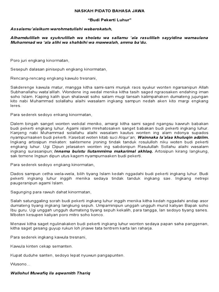 Pidato bertema budi pekerti adalah contoh teksnaskah pidato pendidikan pidato umum menggunakan bahasa indonesia. Kawula nuwung kanthi linambaran pepayung budi rahayu saha hangunjukaken raos suka sukur dhumateng gusti mugi rahayuha sagung dumadi tansah kajiwa lan kasalira dhumateng kula lan pan jengengan sadaya. Di bawah ini ada kumpulan contoh geguritan bahasa jawa dengan berbagai macam tema yang bisa anda tembangkan atau bisa anda jadikan referensi dalam latihan menulis geguritan bahasa jawa. Silahkan anda edit seperti. Contoh pidato bahasa jawa tentang budi pekerti di bawah ini menjadi sebuah referensi yang dapat kita gunakan dalam belajar membuat naskah pidato atau dalam bahasa jawa disebut dengan sesorah. Memang menjadi orang yang jujur itu tidak mudah karena sebenarnya menjadi orang yang jujur kadang kadang musuh baru muncul karena tidak semua orang di lingkungan kita adalah orang yang jujur.