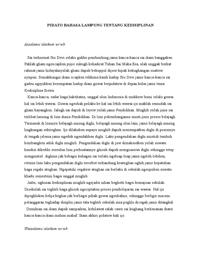 Contoh pidato bahasa lampung. Demikian pidato bahasa lampung semoga bermanfaaat. Diposting oleh unknown di 0359 6 komentar. Contoh pidato yaitu seperti pidato kenegaraan pidato menyambut hari besar pidato pembangkit semangat pidato sambutan acara atau event dan lain sebagainya. Contoh pidato hari kemerdekaan bahasa lampung akhir akhir ini banyak pencarian di mesinnya om google tentang contoh pidato hari kemerdekaan dan tidak sedikit beberapa sekolah yang ada di lampung memberikan tugas bagi siswnya untuk membuat contoh pidato hari kemerdekaan berbahasa lampung karena banyaknya kesibukan sehingga blog pakar lampung jarang update mudahan mudahan postingan yang. Demikian pidato bahasa lampung semoga bermanfaaat. 5 contoh pidato bahasa lampung berikut ini adalah 5 contoh pidato berbahasa lampung dengan berbagai tema seperti kedisiplinan hari pendidikan perpisahan sekolah dan lain lain.