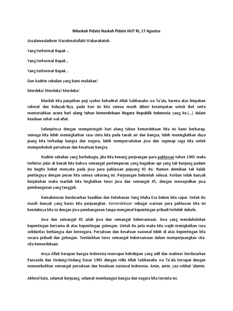 Melalui pidato peringatan hari ulang tahun kemerdekaan ri ke. Contoh sesorah pengetan 17 agustus ini cukup singkat dan sangat mudah dimengerti dari segi bahasanya. Contoh pidato hut ri ke 74 ini dapat anda ubah sesuai dengan kebutuhan dan dengan mudah untuk diedit. Pidato memperingati hut ri ke 75 pidato hari kemerdekaan indonesia tahun 2020 assalamualaikum warahmatullahi wabartakaatuh. Anda sekarang sudah tahu dan yakin anda tidak perlu mencari kemana mana lagi karena kabarmublogspot. Dapat digunakan sebagai contoh dan referensi pembuatan pidato yang baik dan menarik diharapkan dengan pidato tersebut dapat memberikan gambaran kepada sobat untuk dapat membuat pidato yang lebih baik lagi.