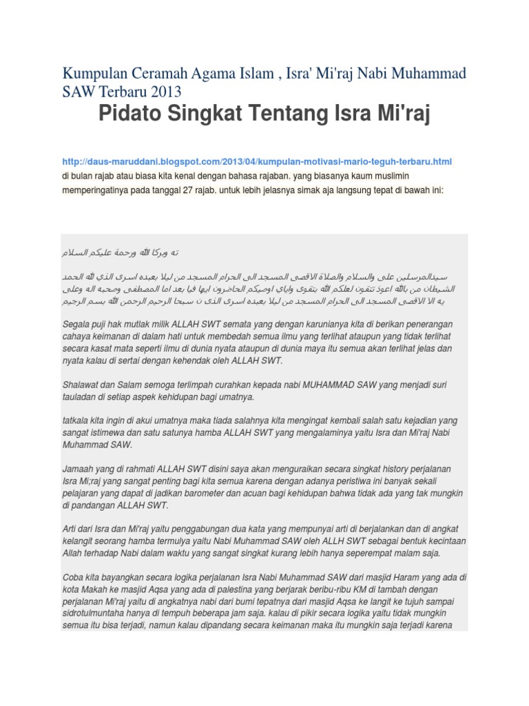 Contoh pidato isra miraj pidato isra miraj biasanya berisi materi tentang suatu pandangan khusus atau fatwa dan pendapat tentang kehidupan manusia dan hubungannya dengan acara isra miraj ini. Contoh ceramah pidato isra miraj nabi muhammad saw kali ini admin postingkan contoh pidato isro miraj silahkan simak di bawah ini. Contoh pidato peringatan isra miraj nabi muhammad saw phbi by rijal habibulloh. Contoh pidato singkat peringatan isra miraj. Dengan adanya tema ini bagi kaum muslimin di seluruh jagat raya tentunya sudah tak asing lagi karena peristiwa isra miraj itu adalah merupakan suatu sejarah terpenting bagi umat islam yang sangat besar dan telah menjadikan suatu agenda tahunan dalam memperingatinya yaitu setiap tiba pada bulah rajab. File berformat microsoft word documents docrtf silahkan download secara gratis dan kembangkan kembali agar lebih sempurna.