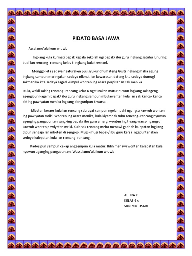 Contoh pidato perpisahan bahasa jawa. Karena masyarakat daerah jawa pada umumnya menggunakan bahasa jawa kromo. Poin poin yang perlu disampaikan diantaranya adalah ucapan terima kasih bagi para guru yang telah berjasa meluluskan anak didiknya. Contoh pidato bahasa jawa krama selanjutnya adalah tentang budi pekerti. Contoh pidato perpisahan kelas 6 bahasa jawa. Pelajaran sd contoh pidato perpisahan kelas 6 dengan bahasa jawa ilustrasi acara wisuda sekolah dasar setelah menempuh ujian sekolah ujian nasional acapkali dalam acara wisuda dan perpisahan sekolah memberikan kesempatan kepada salah seorang siswanya untuk maju menyampaikan sebuah pidato. Wasana cekap semanten atur kula menawi kathah kalepatan atur saha solah bawa ingkang boten mranani penggalih kula nyuwun pengampunten.