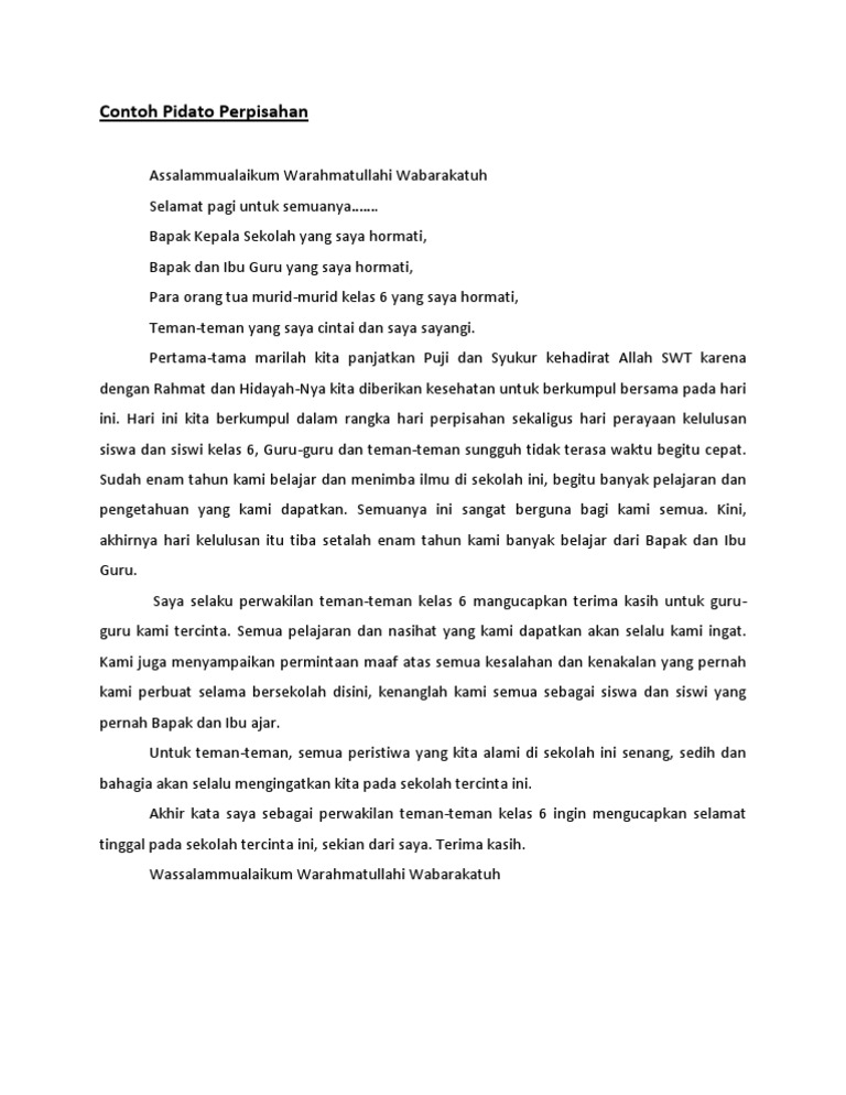 Selain itu juga memberikan tuturial mudah untuk menyampaikan pidato di depan umum. Meskipun singkat namun kata kata pidatonya dijamin sangat mengharukan sehingga bisa membuat pendengar merasakan bagaimana harunya yang namanya perpisahan. Orang yang berpidato disebut orator. Contoh pidato perpisahan guru. Kepada yang terhormat bapak kepaka sekolah dan seluruh rekan rekan guru dari smpn 3 atas nama keluarga besar smpn 3 saya ingin mengucapkan permohonan maaf bila saya melakukan kesalahan kesalahan. Dalam berpidato penampilan gaya bahasa dan ekspresi kita hendaknya diperhatikan serta kita harus percaya diri menyampaikan isi dari pidato kita agar orang yang melihat pidato kita pun tertarik dan terpengaruh oleh pidato yang kita.