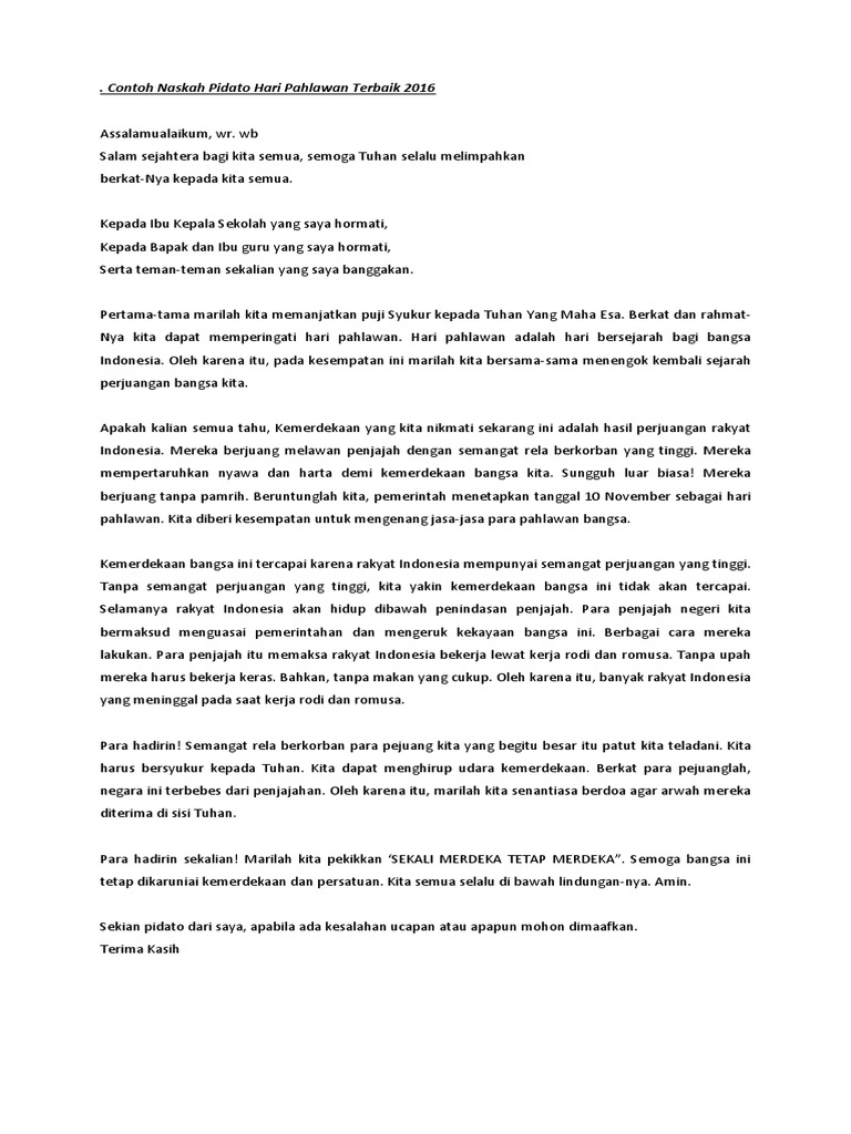 Contoh pidato hari pahlawan hari pahlawan adalah peristiwa sejarah perang antar tentara indonesia dengan belanda yang terjadi pada tanggal 10 november 1945 di kota surabaya. Download pidato hari pahlawan 2017 pidato mk upacara hari pahlawan. Bapak ibu guru yang saya hormati. Pidato kartini syntha. Sekian contoh pidato hari pahlawan dalam bahasa inggris dan artinya semoga memberikan motivasi bagi kita semua untuk meneruskan perjuangan para pahlawan dahulu. Pidato natal papi.