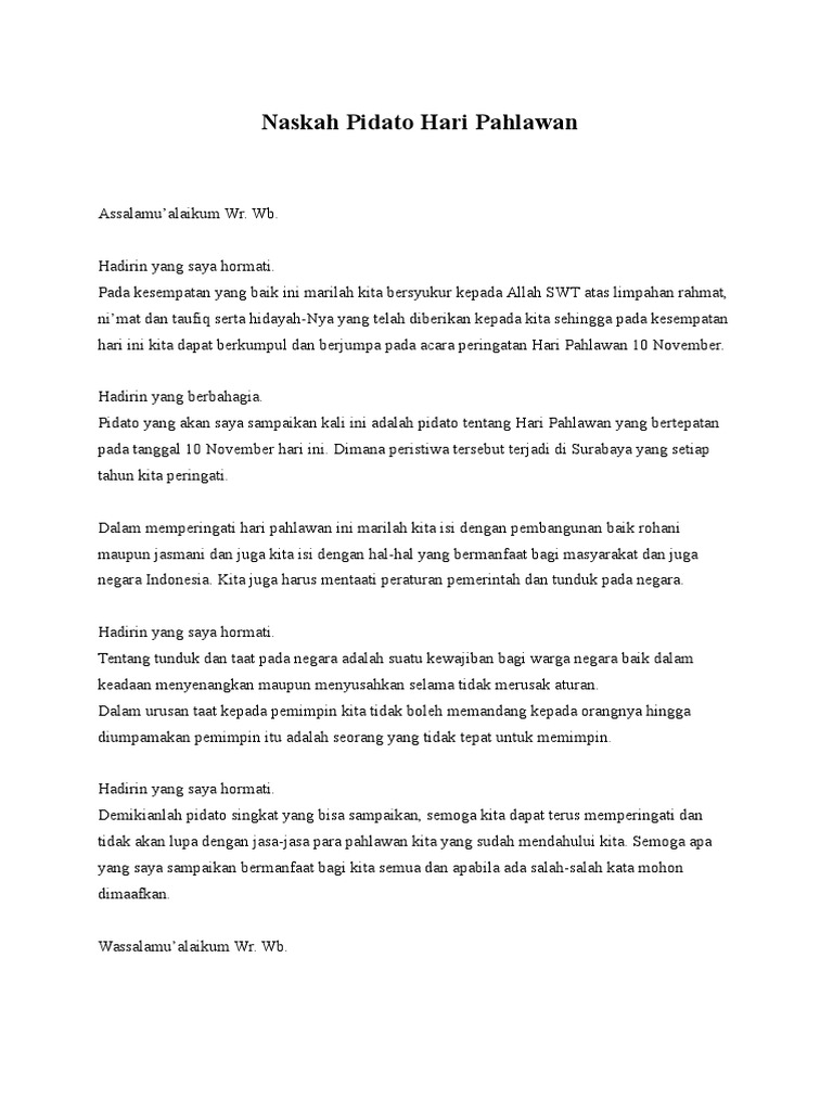 Contoh pidato hari pahlawan hari pahlawan adalah peristiwa sejarah perang antar tentara indonesia dengan belanda yang terjadi pada tanggal 10 november 1945 di kota surabaya. Contoh pidato tentang motivasi diri. Dear ladies and gentleman. Hadirin yang saya hormati. Itulah contoh naskan atau teks pidato tentang hari pahlawan yang panjang buatanku pidato ini juga aku gunakan untuk contoh teks ceramah bahasa indonesia kelas 11 semoga berkenan dan jika ada yang kurang mohon untuk diperbaiki. Semoga contoh naskah pidato kemerdekaan di atas bisa menjadi contoh bagi sobat sekalian dalam membuat pidato tentang pahlawan kemerdekaan yang saya yakin jauh lebih bagus dari pidato di atas.
