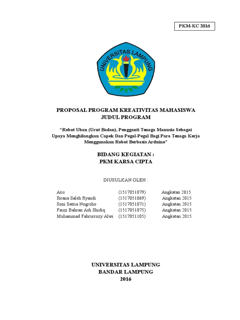 Contoh proposal pkm karsa cipta pkm kc yang di danai oleh dikti. Pkm m gebrakan 5 meja. Pkm kc proposal terpal nasbana terapi bantal panas serba guna. Tips dan trik lolos monev pkm k dan pkm kc tahun 2016 published january 2 2017 ini merupakan kelanjutan dari kisah sebelumnya kisah ini akan menceritakan perjalanan kami untuk menghadapi monitoring dan evaluasi monev dari proposal pkm k kewirausahaan dan pkm kc karsa cipta kami serta tips dan trik menghadapi monev dengan percaya diri. Ada 13 contoh judul pkm kc yang akan dibagikan diantranya sebagai berikut. 78 pkm kc muchsin nur wachid simon templar sistem monitoring pantai.