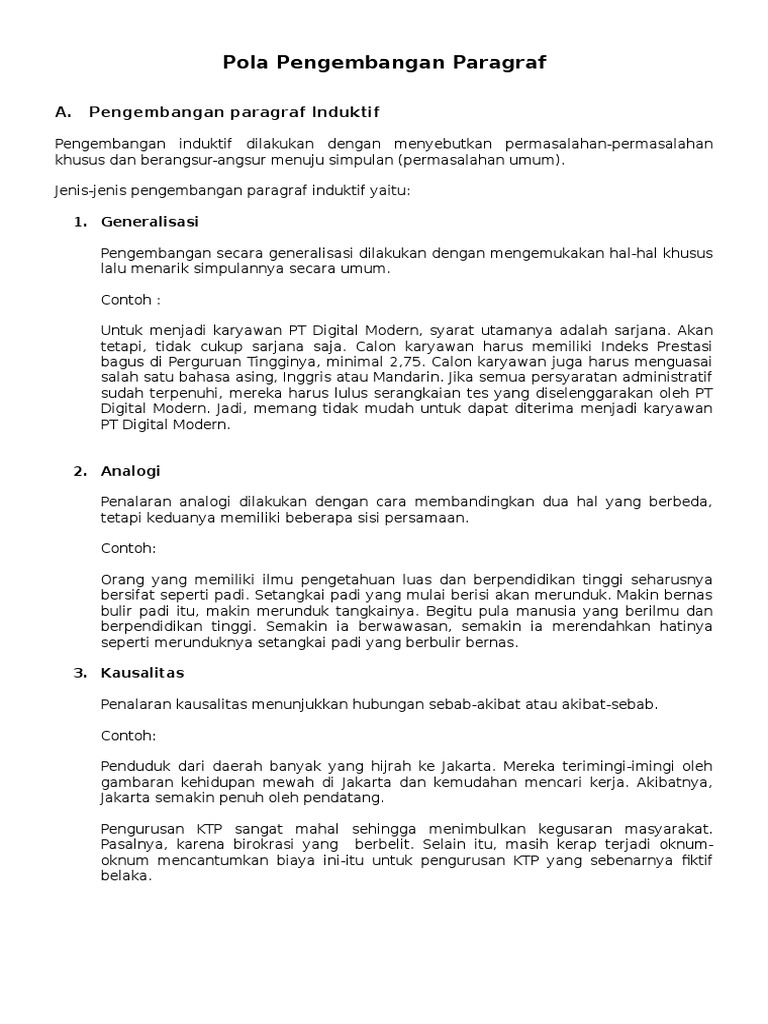 Contoh pola pengembangan paragraf. Pengembangan alamiah pengembangan secara alamiah ini seorang penulis dapat menggunakan pola yang sudah ada pada obyek atau kajian yang dibicarakan. Supaya lebih paham bentuk pola tersebut ketika ditulis ke dalam paragraf berikut beberapa contoh pola pengembangan dalam bahasa indonesia. Narasi pada pola pengembangan ini tentu seperti saat menulis sebuah diary. Adapun yang tergolong paragraf ini diantaranya paragraf klasifikasi dan contoh paragraf analogi singkat. Pola analisis digunakan untuk menjelaskan suatu hal atau gagasan yang sifatnya umum ke dalam perincian perincian yang logis. Pola analisis adalah pola pengembangan paragraf yang biasa digunakan untuk menyusun paragraf eksposisi atau argumentasi.