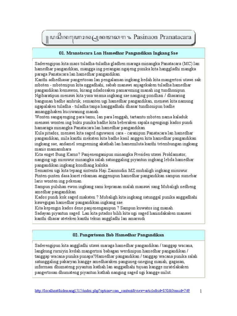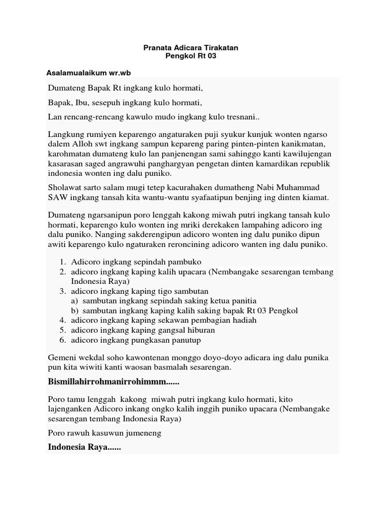Berikut ini contoh sesorah bahasa jawa 17 agustus hut ri singkat. Maka dari itu apapun profesi dan jabatan kita sebagai generasi penerus harus bisa meneladai contoh kegigihan semangat para pahlawan. Contoh sesorah pengetan 17 agustus ini cukup singkat dan sangat mudah dimengerti dari segi bahasanya. Langkung rumiyin monggolah kita sesarengan ngunjukaken takwa. 2contoh teks pranatacara bahasa jawa acara pengajian assalaamualaikum warahmatullaahi wabarakaatuhu innalhamdalillaah nahmaduhu wanastainuhu wanastaghfirruhu wanauudzubillahi min syuruuri anfusina wa min sayyiati amaalina may yahdihillahu fala mudzillalah wa may yudlill fala haadiyalah asyhadu an laailaaha illallaah wahdahu laa syariikalahu wa asyhadu anna muhammadan. Contoh pidato bahasa jawa tentang pendidikan assalamualaikum wr.