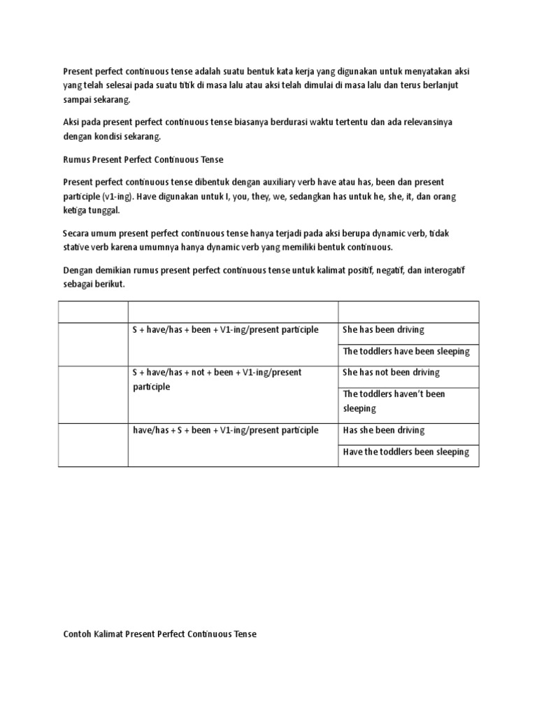 Present perfect tense adalah suatu bentuk kata kerja yang digunakan untuk menyatakan suatu aksi atau situasi yang telah dimulai di masa lalu dan masih berlanjut sampai sekarang atau telah selesai pada suatu titik waktu tertentu di masa lalu namun efeknya masih berlanjut. Present perfect continuous tense adalah suatu bentuk kata kerja yang digunakan untuk menyatakan aksi yang telah selesai pada suatu titik di masa lalu atau aksi telah dimulai di masa lalu dan terus berlanjut sampai sekarang. Contoh kalimat positif negatif interogatif.