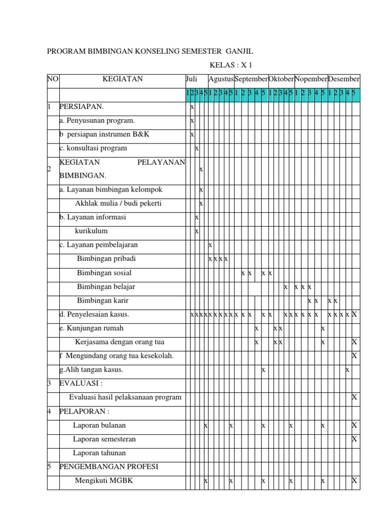 Contoh baru susunan program bk bimbingan konseling smp. Contoh program kerja bimbingan konseling lengkap dengan jadwal kegiatannya jumat agustus 19 2016 keberhasilan atau terlaksanakanya suatu kegiatan di sekolah tidak terlepas dari perencanaan yang matang ditunjang administrasi yang lengkap dan akurat. Program ini memuat unsur unsur yang terdapat dalam berbagai ketentuan tentang pelaksanaan bimbingan dan konseling dan diorientasikan pada pencapaian tujuan kegiatan bimbingan dan. Karena tidak ada petugas bk khusus guru kelas menjadi petugas bk untuk menangani siswa yang menjadi tanggung jawabnya.