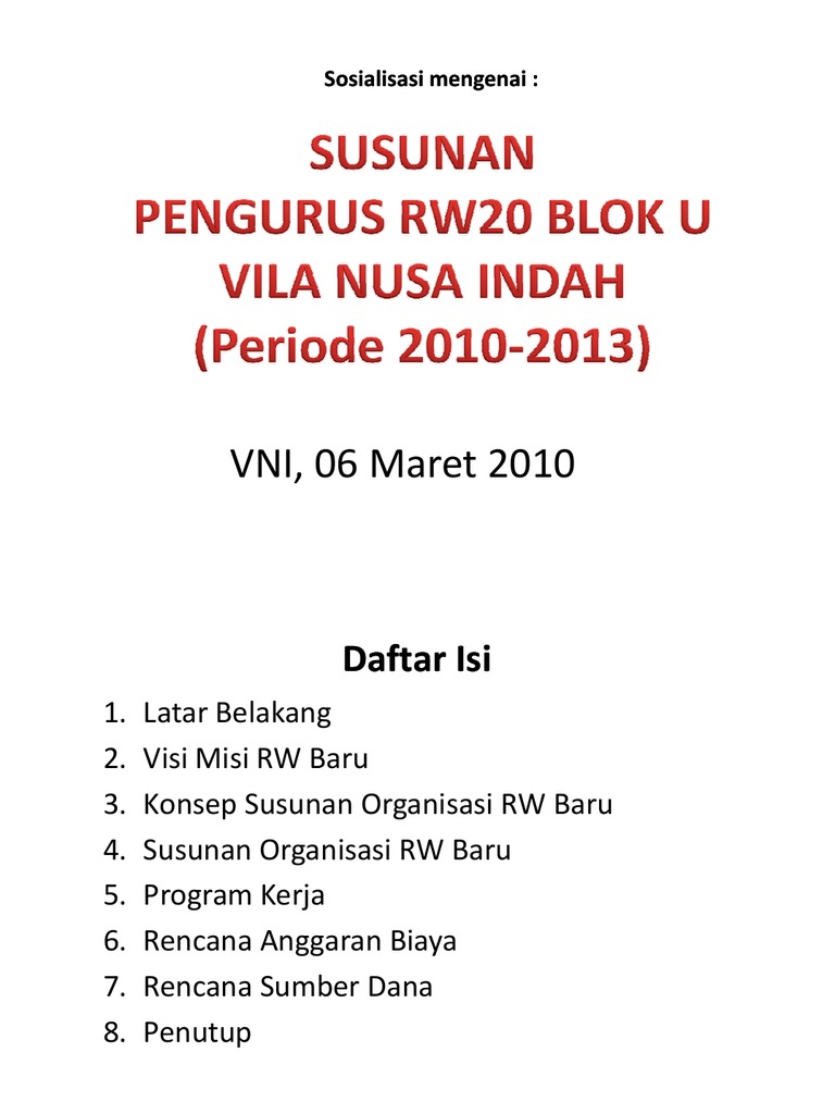 Program kerja bukan lah mainan tetapi senjata utama bagi kemajuan organisasi anda. Walaupun dari aktivitas ini tidak semuanya dapat dirumuskan ke dalam program kerja karena berbagai kendala seperti keterbatasan wewenang rw. Setelah kepengurusan rw 05 dan kepengurusan rt di wilayah rw 05 periode 2010 2013 terbentuk langkah pengurus berikutnya adalah menyusun program kerja serta segera melaksanakannya. Dalam upaya meningkatkan kualitas pelayanan masyarakat diperlukan tingkat efisien dan efektifitas dalam penyelenggaraannya memerlukan pengaturan partisipasi warga pembinaan dan program kerja yang tepat dalam rukun tetanggarukun warga rtrw agar dapat berdaya guna dan berhasil guna pencapaian tingkat kesejahteraan yang diharapkan. Jajaran pengurus berharap dan berusaha dapat menampung aspirasi warga dalam penyusunan program kerja rw. Visi dan misi visi dari rt 01 adalah menjadi warga negara republik indonesia yang mandiri dan rukun tentangga yang amanah terbuka bertanggung jawab dan warga yang religius serta harmonis.