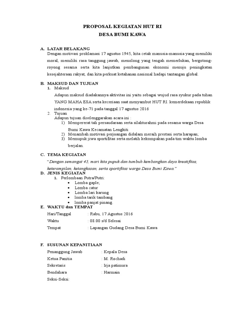 Osis akan membuat daftar kegiatan selama 17 agustusan merancang kebutuhan dana menyusun jadwal kepanitiaan dan sebagainya. Di bulan tersebut biasanya diperingati dengan banyak sekali kegiatan seperti lomba lomba dari tingkat rt rw hingga kecamatan dan kabupaten. Contoh sambutan ketua panitia yang baik dan benar. Nah berikut contoh proposal kegiatan 17 agustus 2019 lengkap dengan biaya. Academiaedu is a platform for academics to share research papers. Dapat remisi hari kemerdekaan 368 napi di sumut bebas.